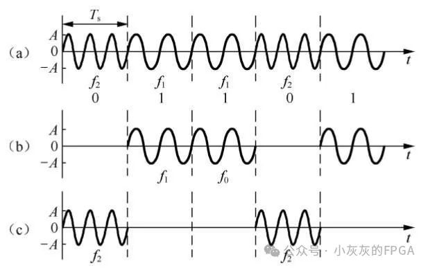 2FSK是用二进制数字信号改变载波的频率,即分别用不同频率的载波承载「0」信号和「1」信号。2FSK信号可分解为「1」码时用载波f1调制和「0」码时用载波f2调制的2个2ASK信号之和。
